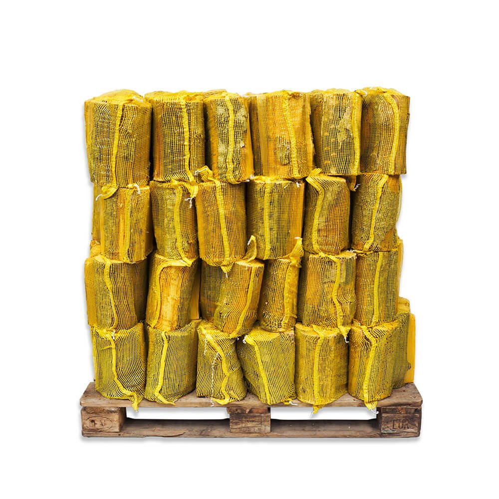 Sehr dicke, im Ofen getrocknete Brennholzscheite in einem Schüttgutsack